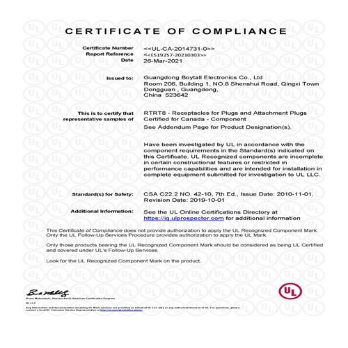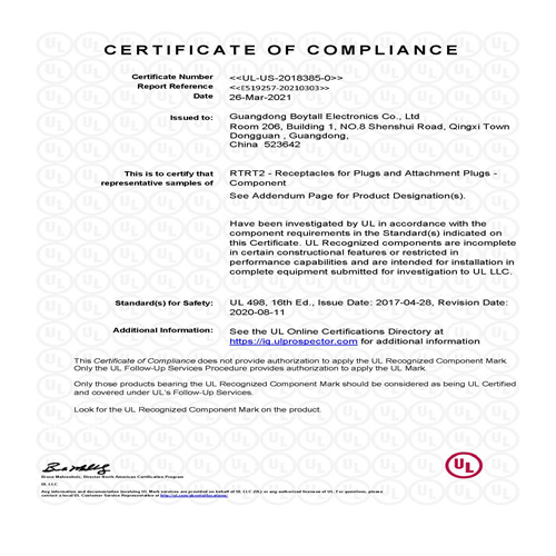 發布時(shí)間:2021-4-28 16:28:43 | 信息來(lái)源:廣東污视频网站入口電子有限公司美式二孔(kǒng)最新UL認證如下圖(tú):